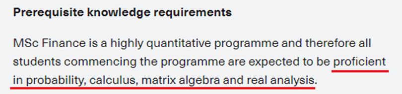 在招生时,学校会重点看申请人的数学成绩。比如帝国理工商学院的MSc Finance,就把要查看的数学科目列在了官网上:
