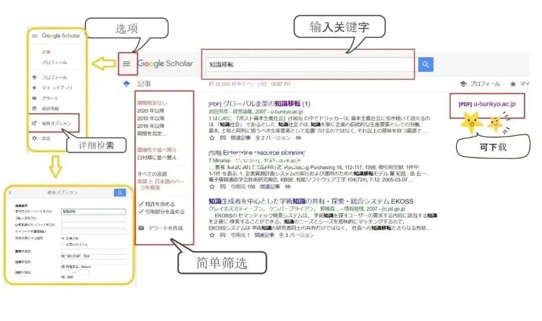 另外,该网站与谷歌学术一样,可以通过关键字检索并提供了详细检索的功能,同学们可以在【检索】下方找到。在左上方可以选择要找的文章是属于哪个类型。检索后下方显示黄色字体【機関リポジト】或者【DOI】、【J-STAGE】等等则为可下载论文。如果没有显示黄色字体一般表示暂未收录。
