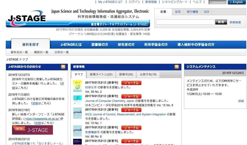 J-STAGE 是由文部科学省下辖的科学技术振兴机构所运营的免费电子杂志阅览系统。现在,和 CiNii 一起共同构成日语学术圈电子版学术文献两大支柱。