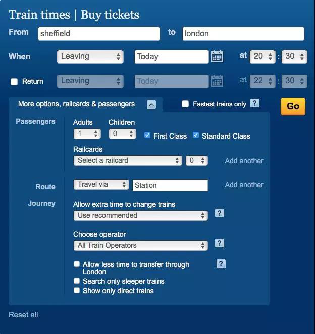 在英国,订火车票是有官方网站的,进入网站后,可以看到这个界面,输入出发地和目的地的站名,出发及回程的时间。