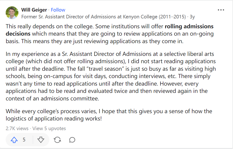 Quora上也有一个关于【大学招生官是立即开始审理申请材料,还是等到截止日期之后才开始审理并决定是否录取呢?】的帖子。