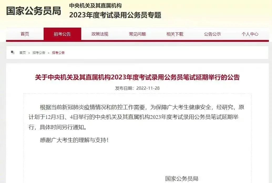 2022年11月28日早上发布,根据当前疫情情况和防控工作需要,为保障广大考生健康安全,经研究,原计划于12月3日、4日举行的中央机关及其直属机构2023年度考试录用公务员笔试延期举行,具体时间另行通知。