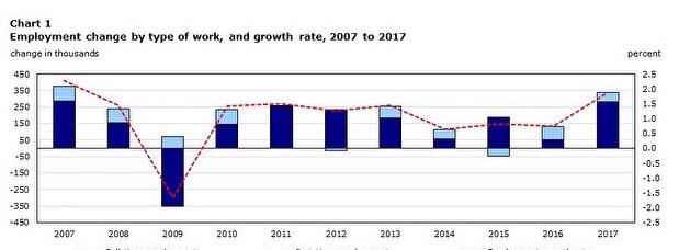 加拿大政府统计数据显示,加拿大 2017 年就业增长速度破了 10 年记录,新职位增加超过 33 万个。