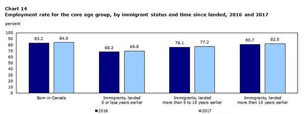 核心年龄段( 25-54 岁)的移民就业率,在 2017 年比加拿大出生的同龄人口增长更快,其中在过去 5 年内登陆的移民就业率增幅最大( 1.6 个百分点)。加拿大出生人口的就业率只上升了 0.8 个百分点。