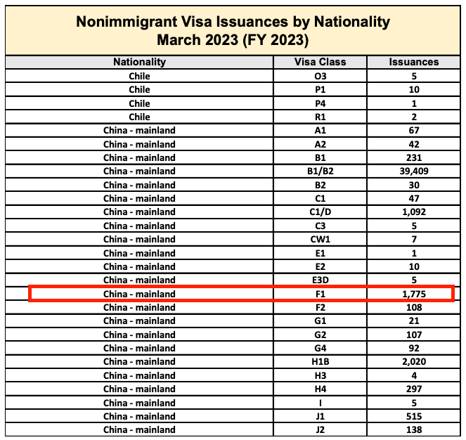 根据美国国务院发布的美海外各使领馆签赴美签证数量报告显示,2023年一季度,共有5413名中国大陆籍学生获得赴美留学F1学生签证;其中1月份2356人,2月份1282人,3月份1775人。(最新数据截至3月)