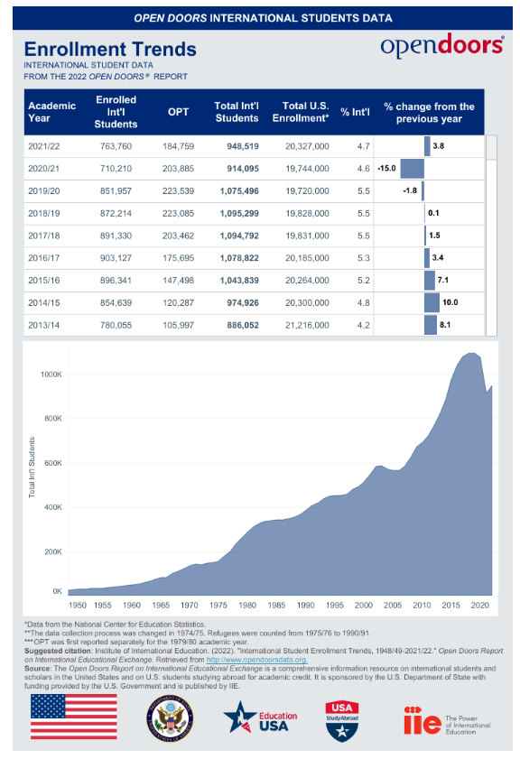 根据发布的《美国门户报告》显示,美国留学生的总数回弹到了94万多人,较上年增长34,424人次,也是近年来增长速度最快的一年。