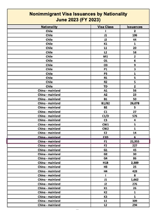 根据美国国务院发布的海外各使领馆签赴美签证数量报告显示,2023年上半年,共有44,762名中国大陆籍学生获得赴美留学F1学生签证,其中五月和六月更是分别发出了13,405和21,955张F-1签证。