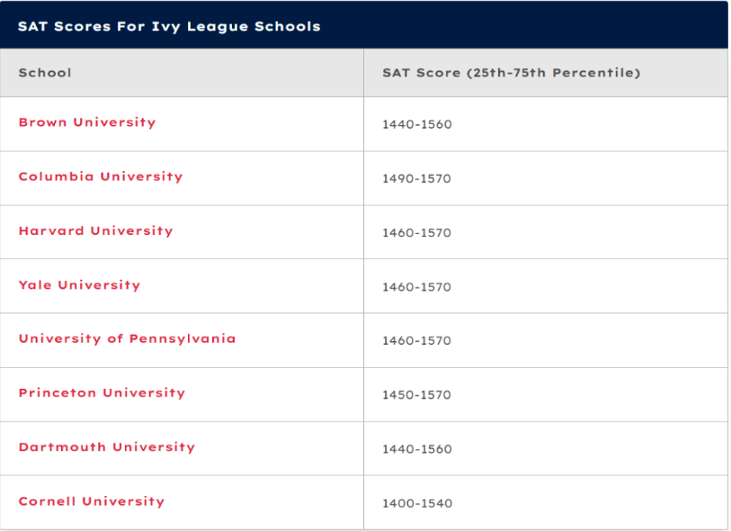 BestColleges统计了2023年申请季八大藤校录取学生提交的标化考试25%-75%分数区间,依然是一如既往的高出天花板。