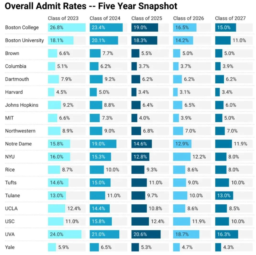 上图是一些美国热门名校近五年的录取数据,从2023届(19Fall)到2027届(23Fall)的录取率情况