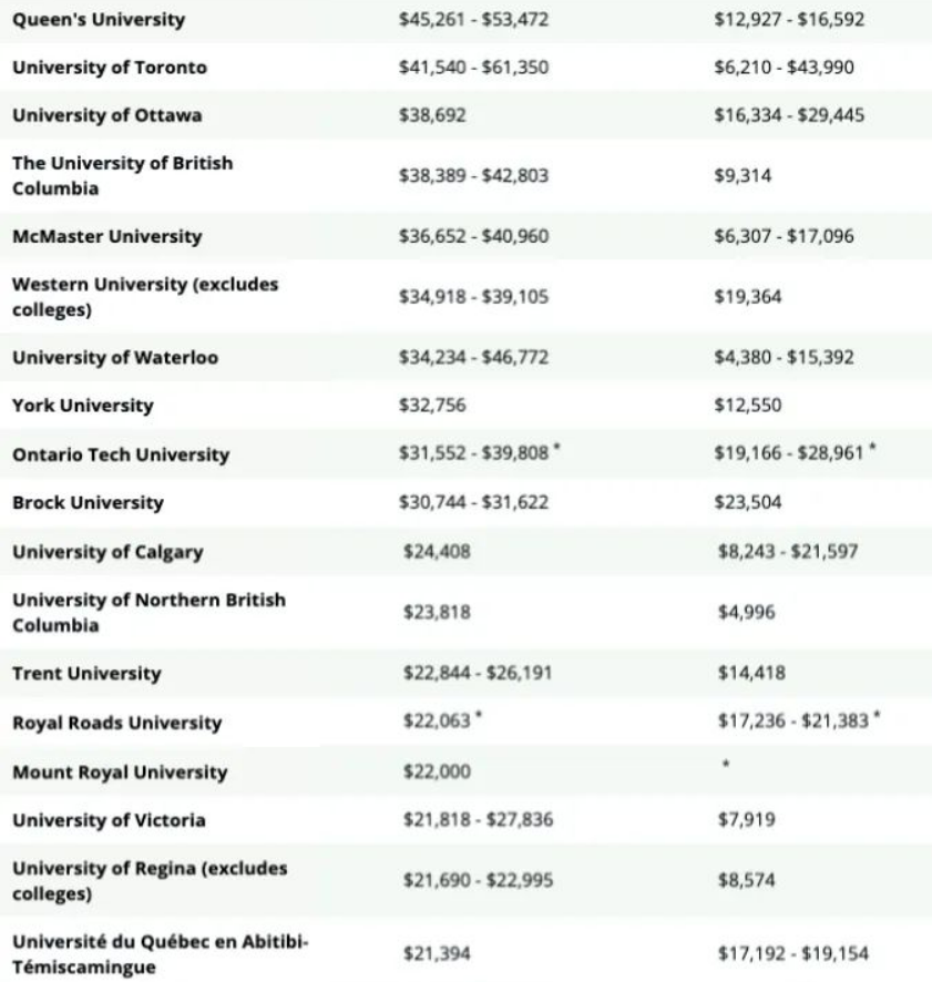 2022-2023年加拿大全日制艺术与人文专业国际学生大学学费(加元)