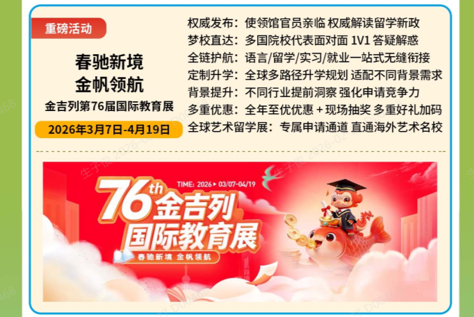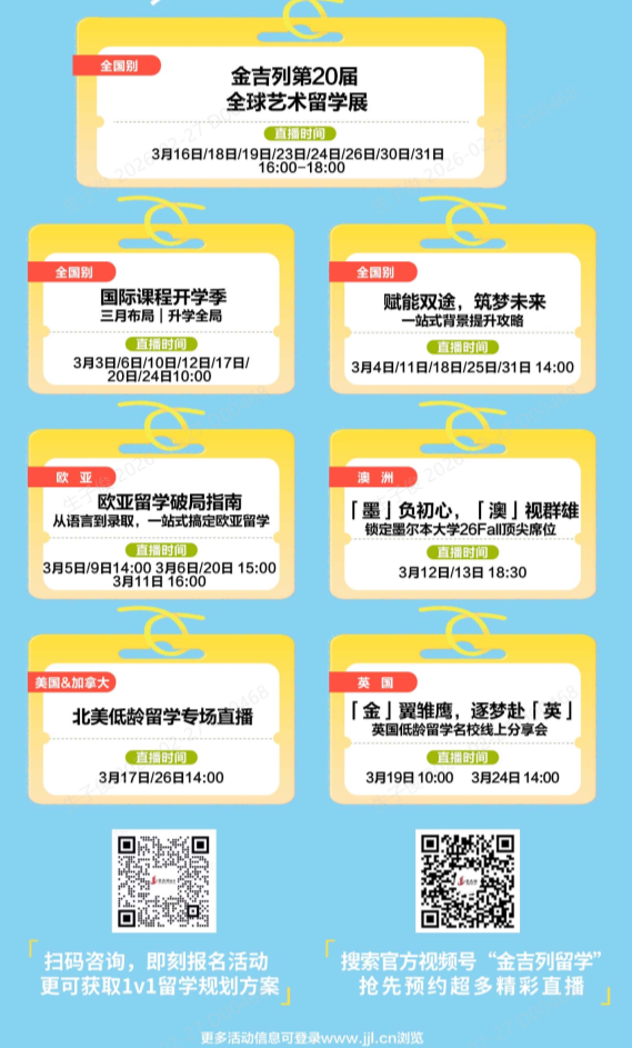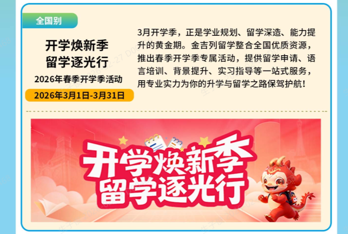 3月开学季,正是学业规划、留学深造、能力提升的黄金期。金吉列留学整合全国优质资源,推出春季开学季专属活动,提供留学申请、语言培训、背景提升、实习指导等一站式服务,用专业实力为你的升学与留学之路保驾护航!