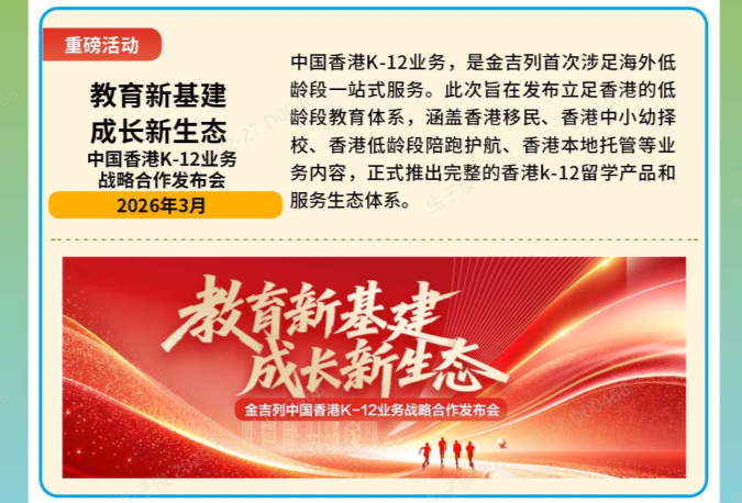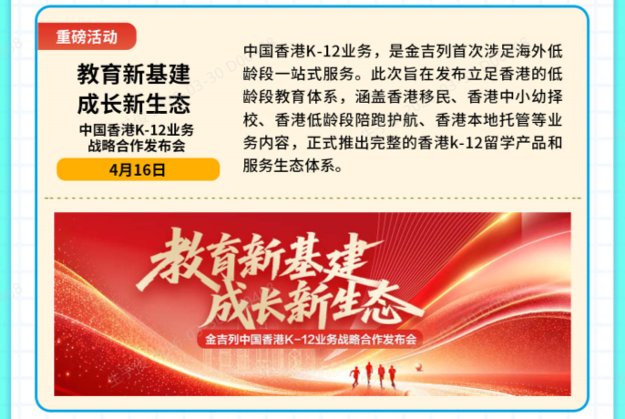 中国香港K-12业务,是金吉列首次涉足海外低龄段一站式服务。此次旨在发布立足香港的低龄段教育体系,涵盖香港移民、香港中小幼择校、香港低龄段陪跑护航、香港本地托管等业务内容,正式推出完整的香港k-12留学产品和服务生态体系。