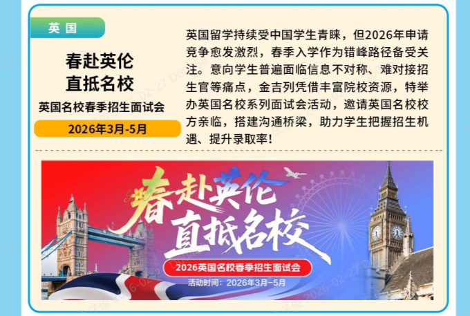 英国留学持续受中国学生青睐,但2026年申请竞争愈发激烈,春季入学作为错峰路径备受关注。意向学生普遍面临信息不对称、难对接招生官等痛点,金吉列凭借丰富院校资源,特举办英国名校系列面试会活动,邀请英国名校校方亲临,搭建沟通桥梁,助力学生把握招生机遇、提升录取率!