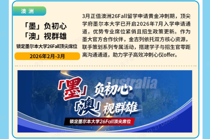 3月正值澳洲26Fall留学申请黄金冲刺期,顶尖学府墨尔本大学已开启2026年7月入学申请通道,优势专业席位紧俏且招生政策更新。作为墨大官方合作伙伴,金吉列依托双方核心资源,联手策划系列专属活动,搭建学子与招生官零距离沟通通道,助力学子高效冲刺心仪offer。