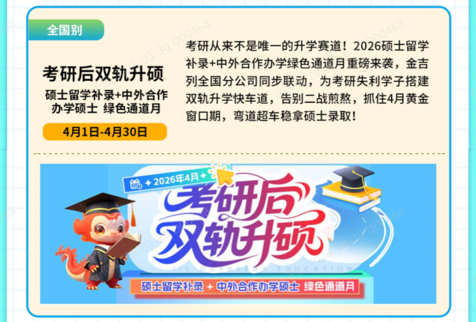 考研从来不是唯一的升学赛道!2026硕士留学补录+中外合作办学绿色通道月重磅来袭,金吉列全国分公司同步联动,为考研失利学子搭建双轨升学快车道,告别二战煎熬,抓住4月黄金窗口期,弯道超车稳拿硕士录取!