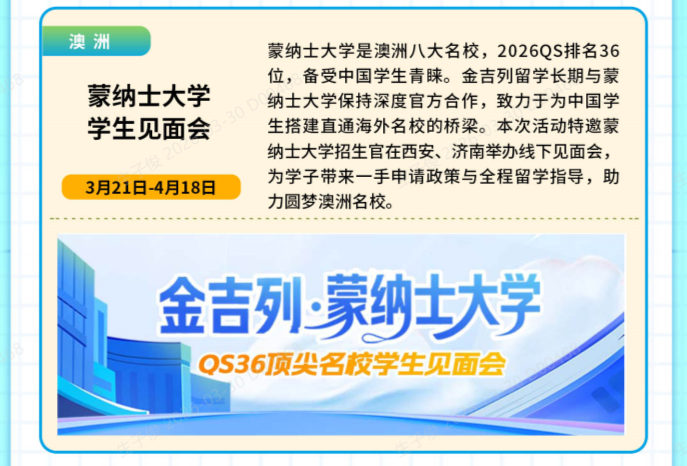 蒙纳士大学是澳洲八大名校,2026QS排名36位,备受中国学生青睐。金吉列留学长期与蒙纳士大学保持深度官方合作,致力于为中国学生搭建直通海外名校的桥梁。本次活动特邀蒙纳士大学招生官在西安、济南举办线下见面会,为学子带来一手申请政策与全程留学指导,助力圆梦澳洲名校。