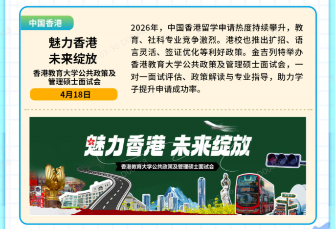 2026年,中国香港留学申请热度持续攀升,教育、社科专业竞争激烈。港校也推出扩招、语言灵活、签证优化等利好政策。金吉列特举办香港教育大学公共政策及管理硕士面试会,一对一面试评估、政策解读与专业指导,助力学子提升申请成功率。