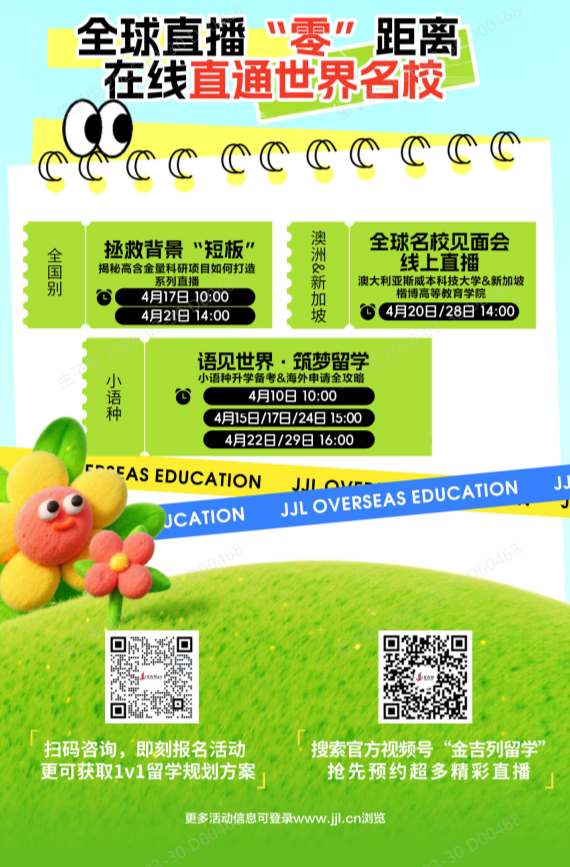 4月扬帆冲刺,offer直通世界,金吉列4月精彩活动+直播讲座。春申季全力冲刺,解锁理想院校。