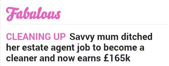 据《太阳报》报道,2012年,44岁的Johi McGrath太太为了想要一份更悠闲的工作,冒险辞掉干了15年的房产经纪人工作,转而去做清洁工,现今已经建立了一个自己的清洁工王国,年收入已高达16.5万英镑(约人民币148万)。
