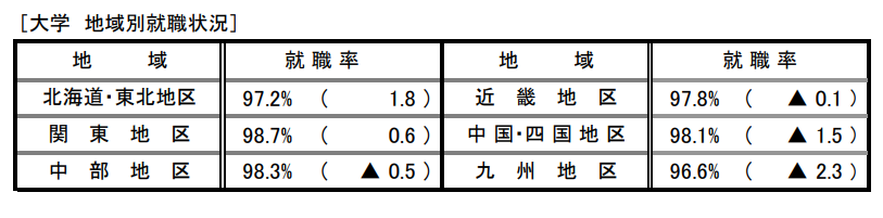各 地区就业率 从高到低依次为:关东地区 98.7%、中部地区 98.3%、中国四国地区 98.1%、近畿地区 97.8%、北海道东北地区 97.2%、九州地区 96.6%。