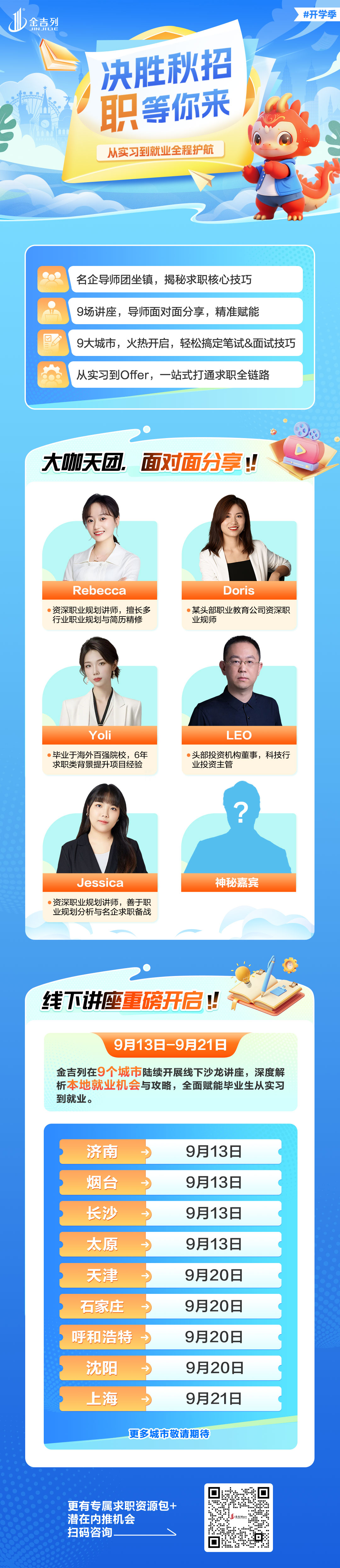 线下:9月13日-9月21日期间,金吉列联合合作方于全国9个城市陆续开展沙龙讲座,深度解析本地就业机会与攻略,全面赋能毕业生从实习到就业。