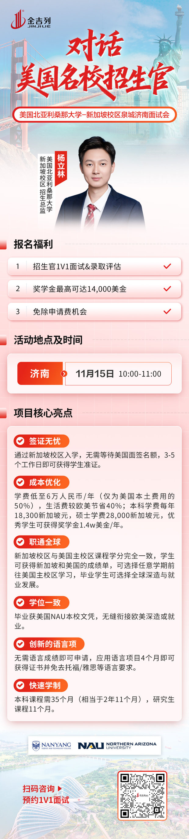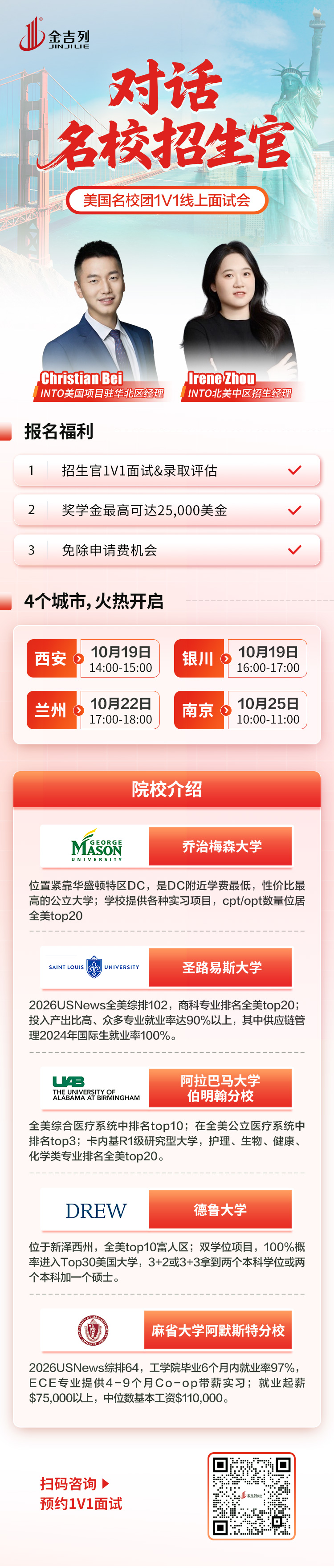 对于志在深造的学子而言,尤其是中国学生,了解最新的招生政策、录取偏好以及项目动态显得至关重要。为此,金吉列携手多所顶尖院校代表,开展【对话名校招生官】活动!