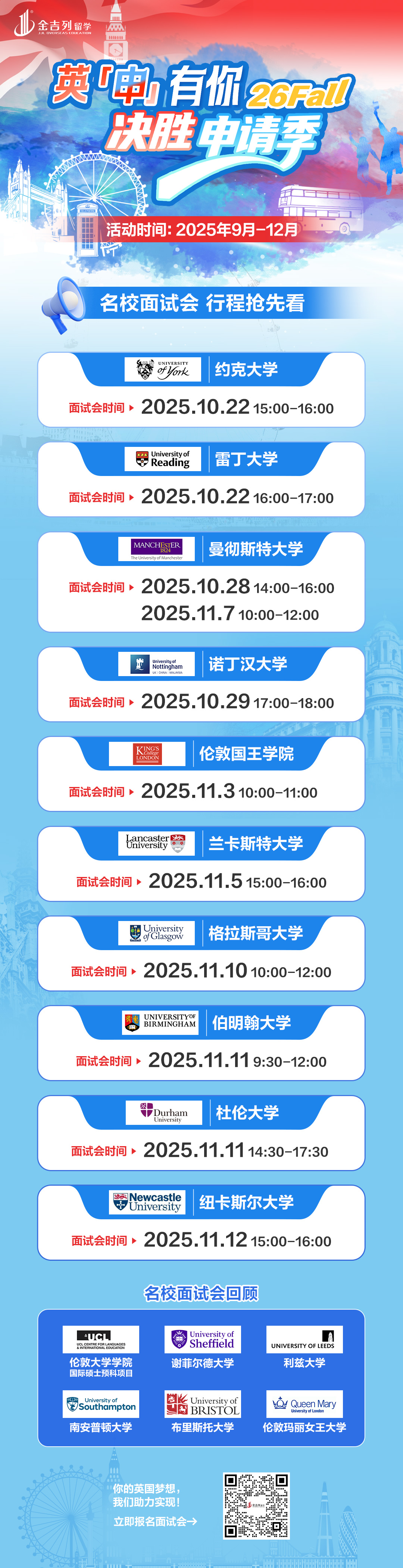 为帮助学生精准对接英国优质教育资源,金吉列留学特别策划了英「申」有你,决胜26Fall申请季系列专题活动,通过线上直播解读政策、线下院校面对面咨询等形式,为学生提供选校、申请、签证的全流程指导。