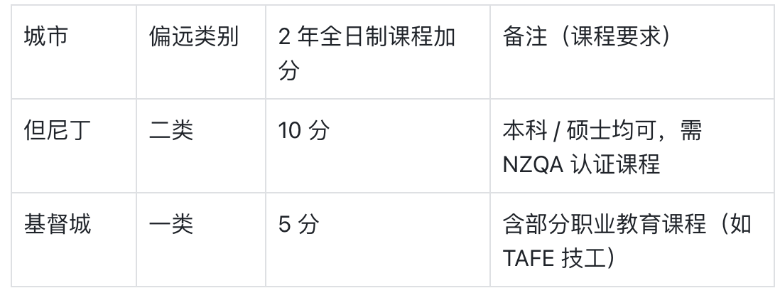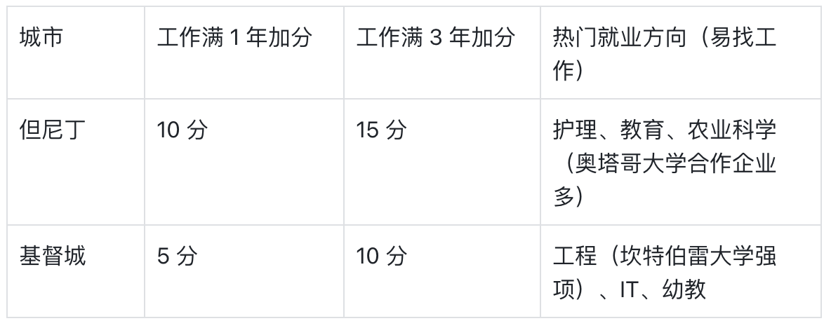 关键:但尼丁工作 1 年(10 分)= 基督城工作 3 年(10 分),二类地区工作加分效率更高。
