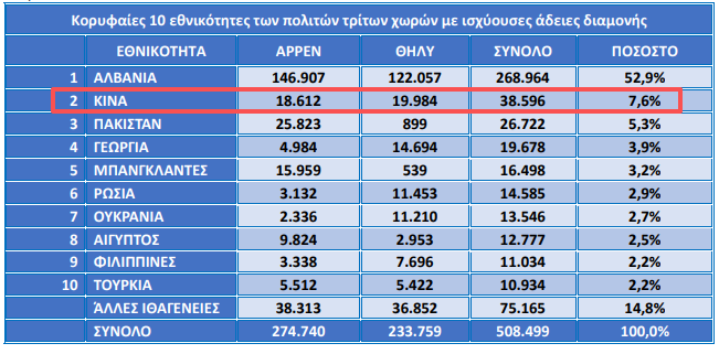 当前数据显示,在希腊持有有效居留许可的中国籍公民总数为38,596人。具体而言,男性公民人数为18,612人,女性公民人数为19,984人,这一群体占在希腊第三国公民总数的7.6%。