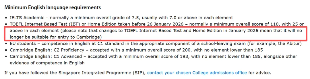 剑桥大学官方对国际学生本科申请的最低英语语言要求(Minimum English language requirements)进行了更新,其中明确规定: 自 2026年1月及之后考取的托福成绩(包括家庭版)将不再被认可,无法作为申请剑桥大学本科的入学语言成绩依据。