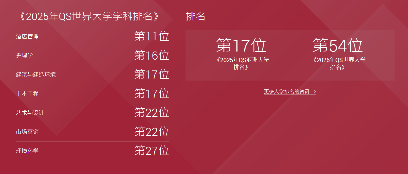 香港理工大学在2025年QS世界大学学科排名中,酒店管理全球第11位,护理学第16位,建筑与住宿环境、土木工程第17位,艺术与设计第22位,市场营销第22位,环境科学第27位。2026年QS世界大学排名居全球第54位。