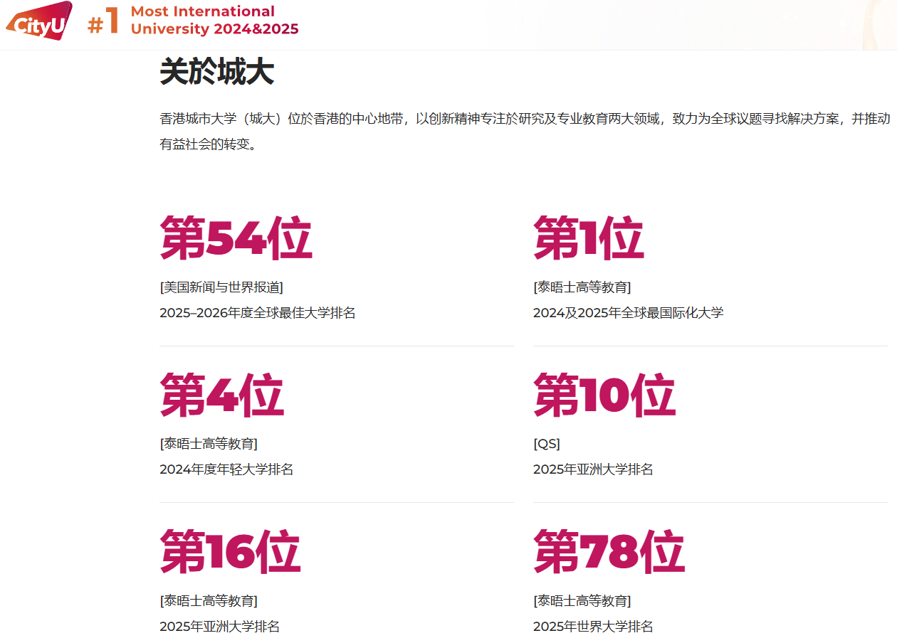香港城市大学(城大)是一所在研究和专业教育方面表现卓越的全球 领先大学,2025年亚洲大学排名位列第10,2024&2025年泰晤士高等教育全球国际化大学排名位列第 1 位,2024年 泰晤士高等教育年轻大学排名位列第 4位。
