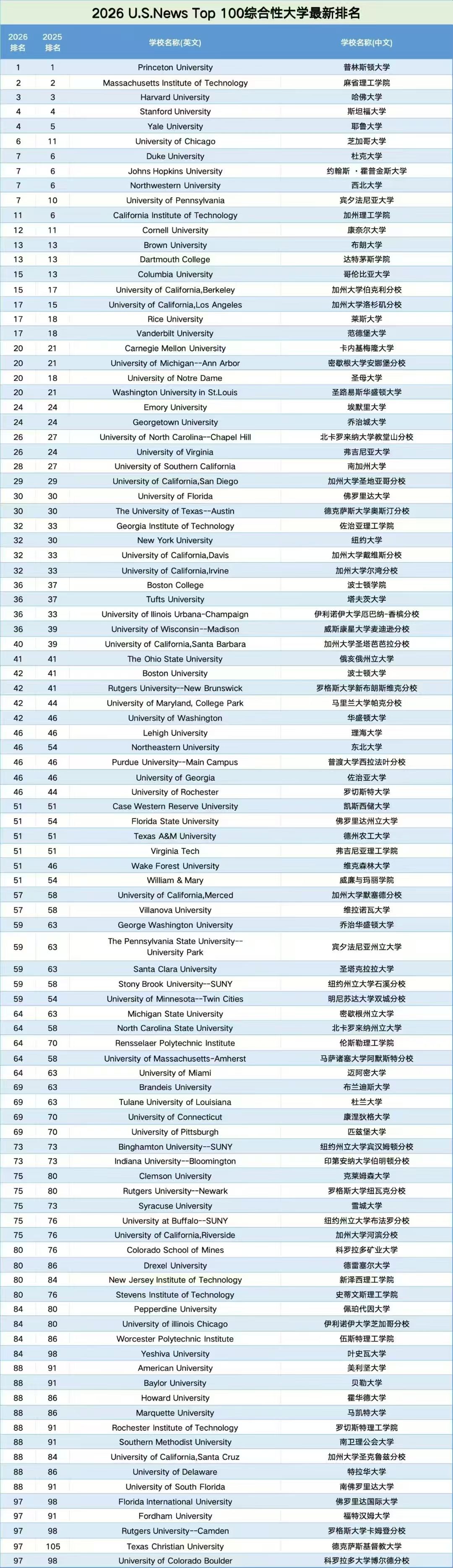 2026年榜首再次由普林斯顿大学夺得,实现连续15年蝉联全美第一。
