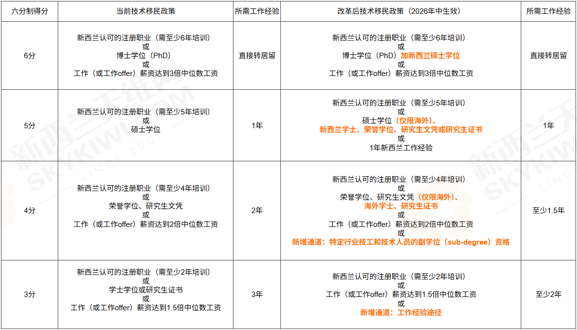 下图为 当前技术移民六分制 与 改革后新政策 对比, 标橙 为改动部分。