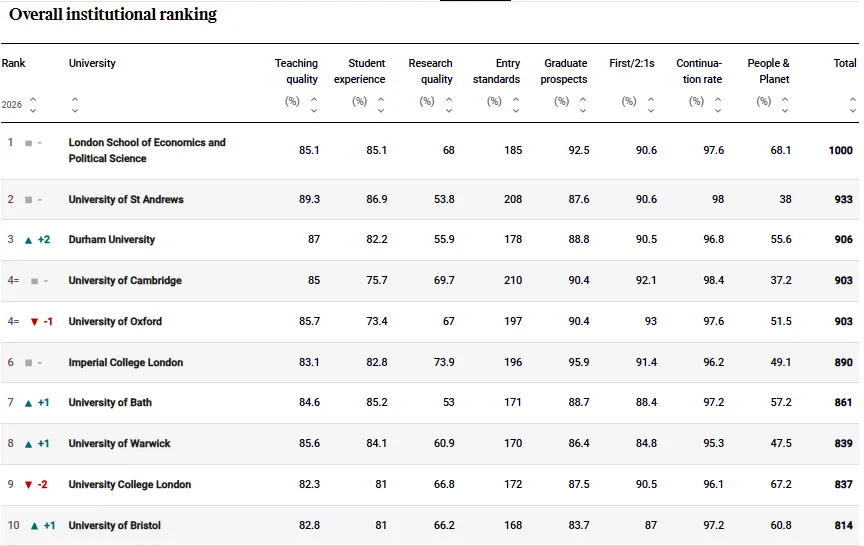 圣安德鲁斯大学 表现稳定,继续位列第2;杜伦大学击败牛津大学,位列第3;