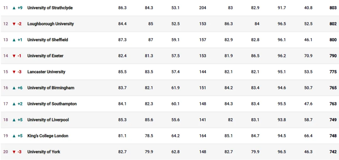 前十名中, 巴斯大学、华威大学与布里斯托大学 均上升1个位次,分别位列第7、第8、第10。