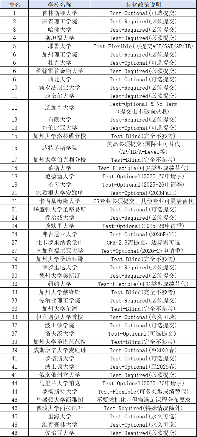 TOP50高校标化政策(SAT/ACT要求)