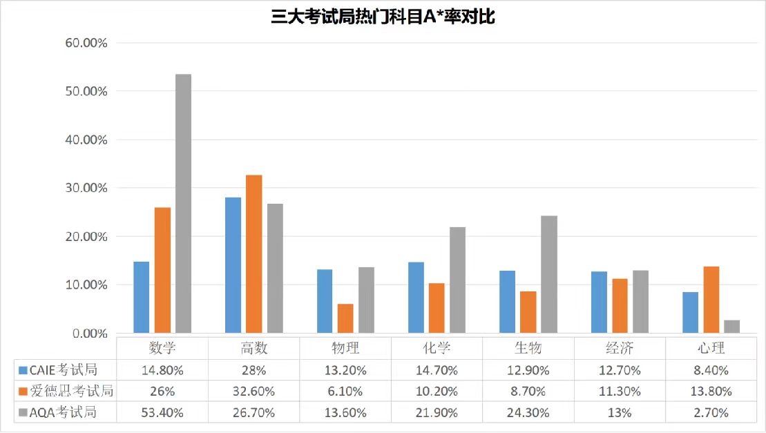 CAIE、爱德思、AQA三大考试局,应该如何选择呢,每个考试局得A*率都有何差别,我们可以从以下图表对比中看出: