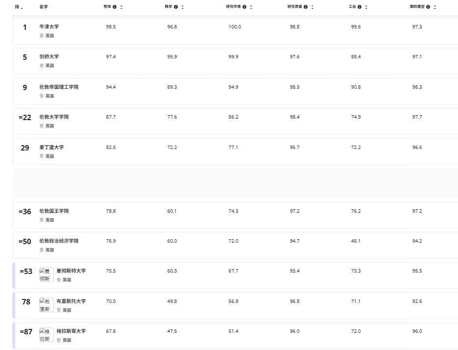 2025 年泰晤士高等教育世界大学排名,该榜单受到全球学生、教师、政府和行业专家的信赖,对来自 115 个国家和地区的 2,092 所机构进行了排名。其中英国排名前10的院校是:牛津大学、剑桥大学、帝国理工学院、UCL、爱丁堡大学、KCL、LSE、曼彻斯特大学、布里斯托大学、格拉斯哥大学。