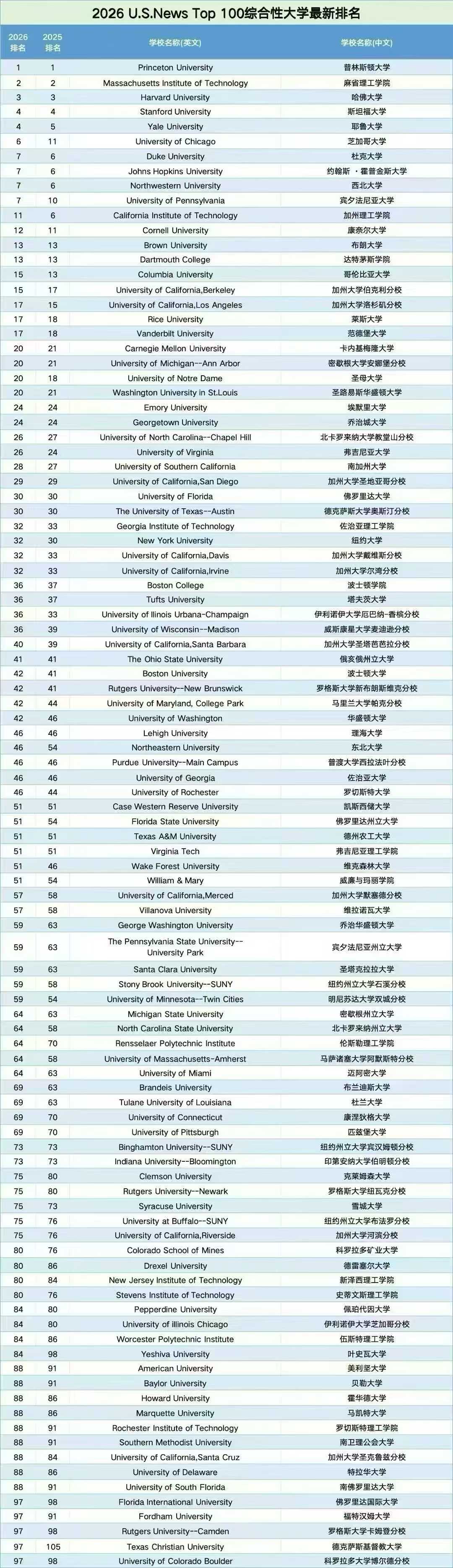 又到了一年US News出炉全美大学排行榜的日子了!2026 U.S.News全美排名发布!