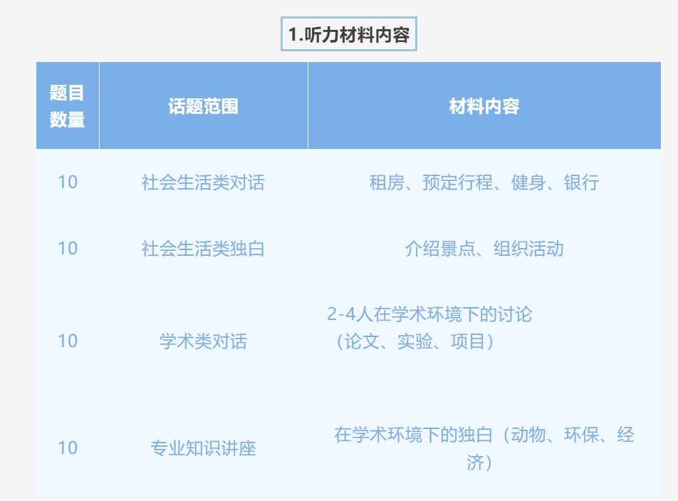听力考试分为四个部分,每个部分有10道题,每题1分。