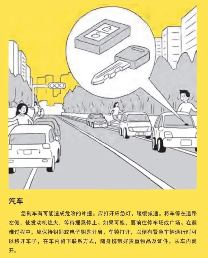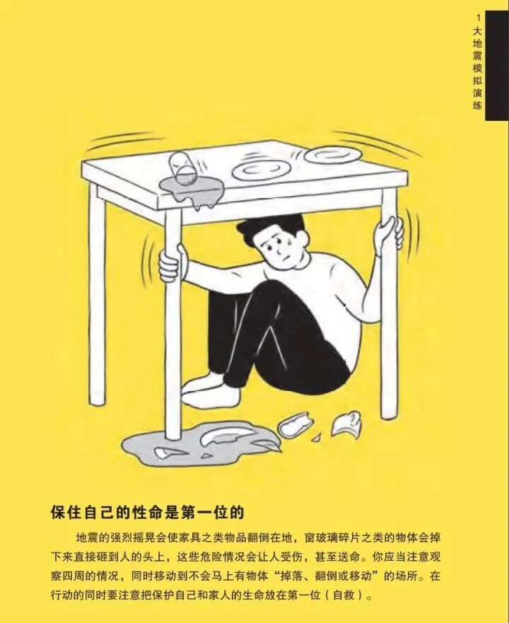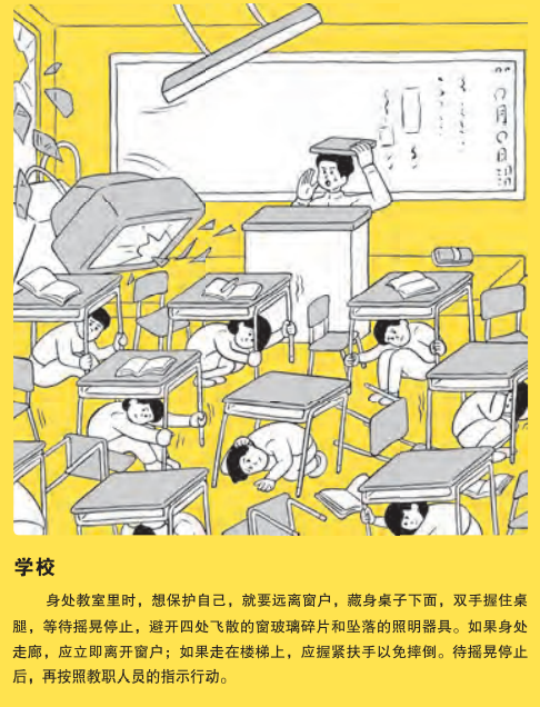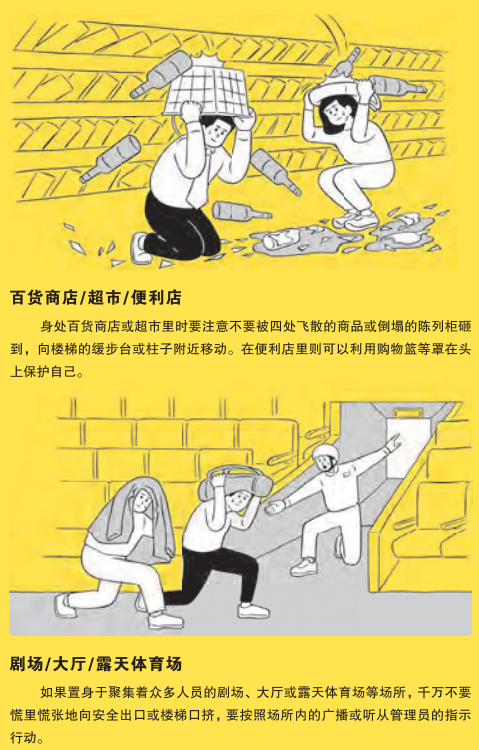 如果地震发生,请第一时间采取保护自己的措施A 身在室内的情况:注意从周遭掉落的物品,保护好头部,寻找桌子或可躲避的场所,同时确保开门的逃生路线,保证照明B 身在室外的情况:远离摇摇欲坠的墙壁或建筑物,寻找避难空地C 身在地下室的情况:跟随管理员避难撤离,保持冷静,不要恐慌D 身在海边的情况:即使海啸警报与避难劝导到来之前,也要立刻远离海浪,寻找高地避难。