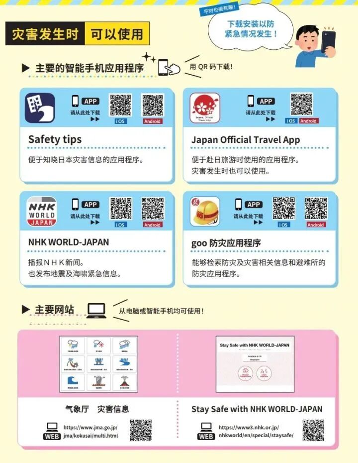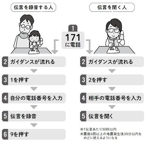 地震过后,通讯信号可能会中断、手机无法正常接通,这时想要和家里人取得联系,确认彼此的情况,可以选择拨打NTT灾难专用传话通讯号码「171」、「災害用伝言板サービス」的方式与家人朋友联系、寻求帮助等。部分大学也普及了大学专用的安否确认网址,向指定地址发送邮件即可报平安。