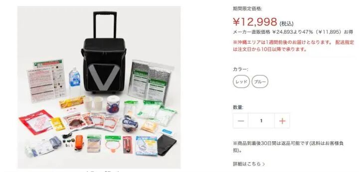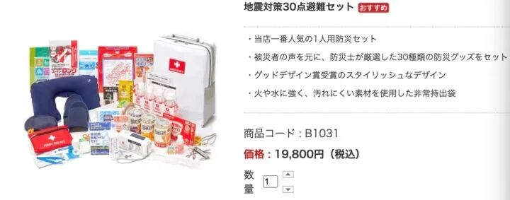 事先准备灾害时可能需要的物品,相当重要!由于日本灾害频发,日本人从小就开始进行防灾教育,几乎每个日本人的家里都会备好急救包以备不时之需。日亚、乐天都可以直接购买,包含有长时间储存的方便食品、饮用水、急救药包、手电筒等东西。