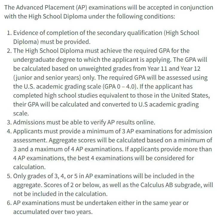 需至少提交3门AP考试成绩,考虑4门成绩的AP科目(低于3分科目不参考),AP考试须在同一年度完成,或可在两个年度内累计完成。