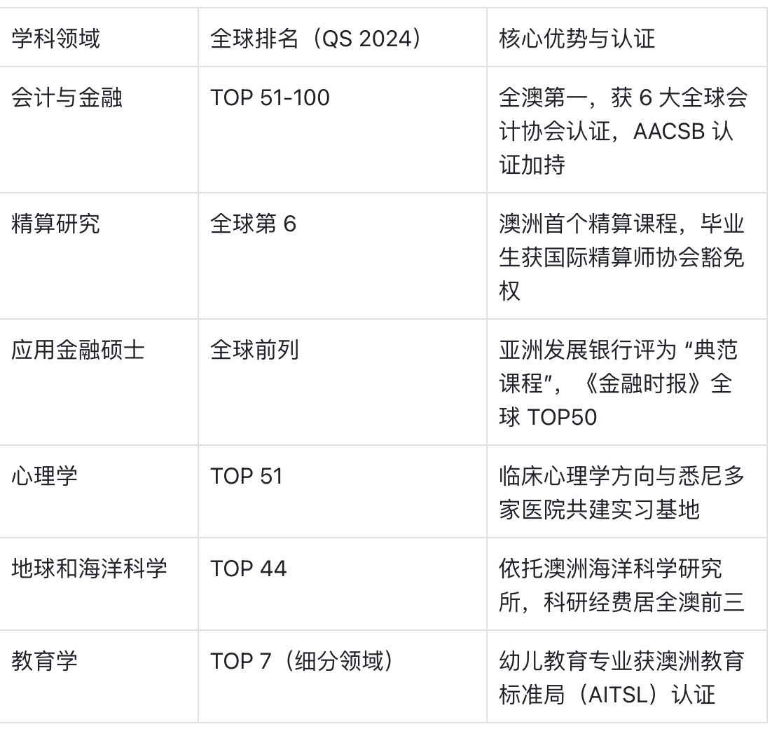商科特色 :管理学院同时获 AACSB 与美国管理会计师协会(IMA)认证,是澳洲唯一获此双重认可的院校,会计课程可直接衔接 CPA、ACCA 等职业资格考试。