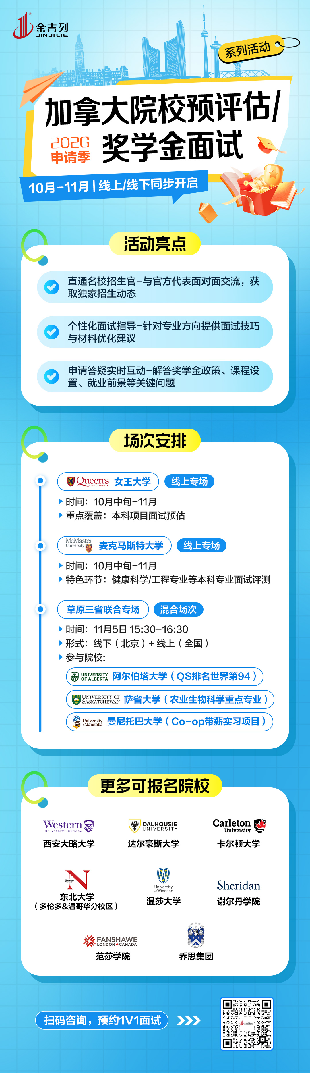 为帮助申请者高效应对挑战,金吉列联合多所加拿大知名高校开启“2026申请季加拿大院校预评估/奖学金面试系列活动”。活动中官方招生代表莅临,为留学家庭提供一对一面对面线上/线下交流机会,助力学生获取最新招生政策与录取偏好。参与者还可获得个性化面试指导,由专业导师围绕申请方向,提供从自我介绍到材料优化的全流程建议。院校老师可以全面解答奖学金申请、课程特色、就业前景等核心问题,扫除信息盲区,增强申请竞争力。