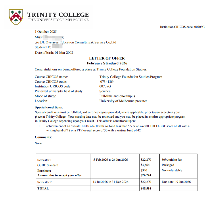 在 “千军万马过独木桥” 的高考竞争中,越来越多家庭开始思考:除了紧盯国内高考分数线,是否有一条更适合孩子的 “突围路径”?答案是肯定的 —— 通过海外优质预科项目衔接世界顶尖大学,正成为许多学生实现 “名校梦” 的新选择。今天,我们就以 墨尔本大学预科 + 本科录取 的真实案例为切入点,拆解这条 “换赛道” 的可行路径,为迷茫中的家庭提供参考。