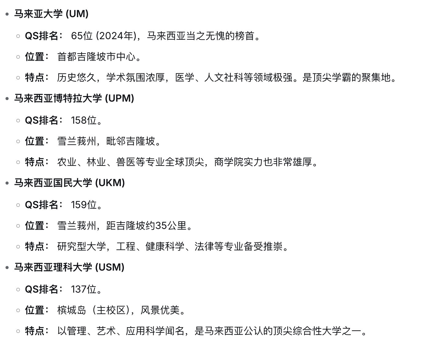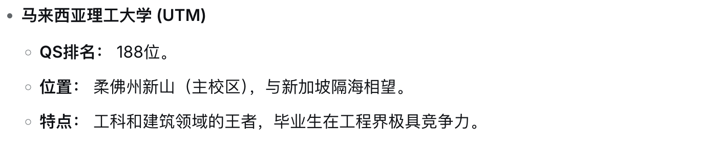 马来西亚公立大学以其强大的科研实力和政府背景享誉世界,是传统意义上的“名校” , 特点是 “高门槛、高要求、低花费”。