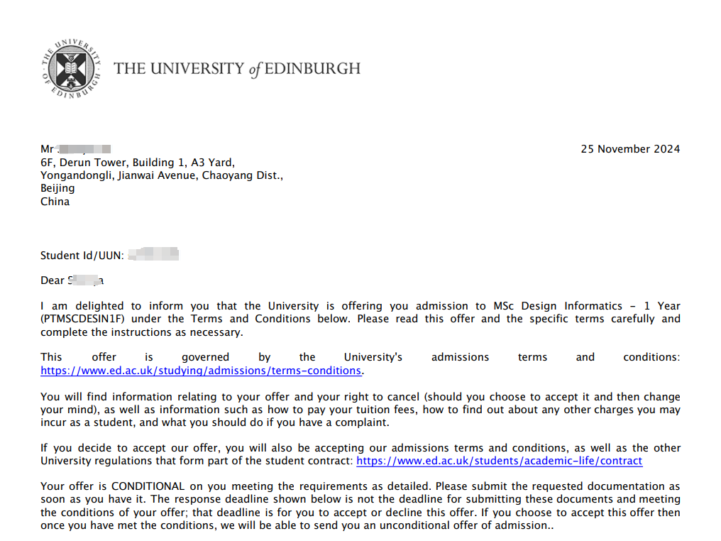 金吉列留学团队在深入了解L同学的情况后,迅速为他制定了一套专属的申请策略。尤其在文书撰写上,团队挖掘L同学计算机专业背景与 Design Informatics 专业的契合点,突出他在实习过程中所展现出的创新思维、项目实践能力以及对设计与信息技术融合领域的独特见解。将这段看似普通的实习经历进行深度加工,让招生官看到L同学与专业的高匹配度和潜在的学术研究能力。在我们的专业指导以及学生高度配合下,最终成功收获录取,学生圆梦!